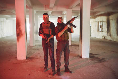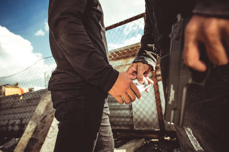 Two Robbers holding a gun at abandoned building. Low key photo and selective focus. criminality concept.