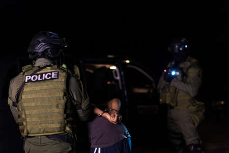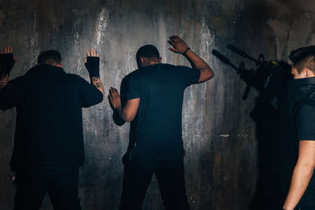 Arrested bandits near the wall at night. Security, people outside the law, megalopolis night life, drug trafficking, violence and social problems of society concept