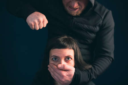 Rape victim sad frightened woman is leaned on wall, gun-threatened by maniac in dark tunnel at street at day time, man rapist in black wear and mask. Sexual assault and abuse concept. Violence