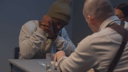 Close-up of black criminal grabbing the gun and threatening to harm cops. He trying to escape from interrogation room.