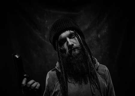 A dangerous hooded man stands in the dark and holds a broken bottle. The face is not visible. The concept of crime, murder.