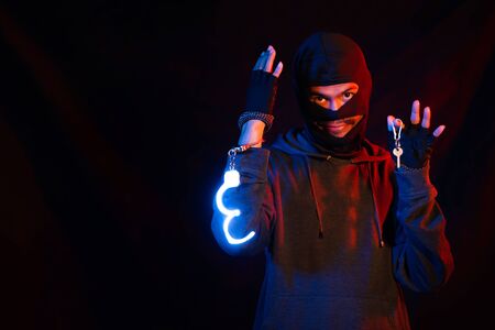 Robber wearing balaclava isolated on black background,Manually unlock the key