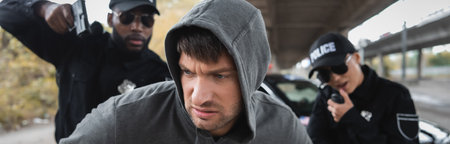 displeased thief looking away near multicultural police officers aiming with pistols on blurred background outdoors, banner