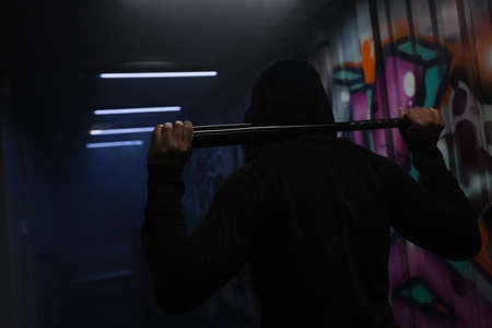Back view of african american vandal in hoodie holding baseball bat in garage with graffiti