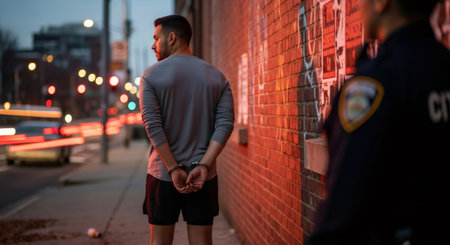 Man in handcuffs arrested by police officer on sidewalk at night. Detention concept for crime, law enforcement, and justice.