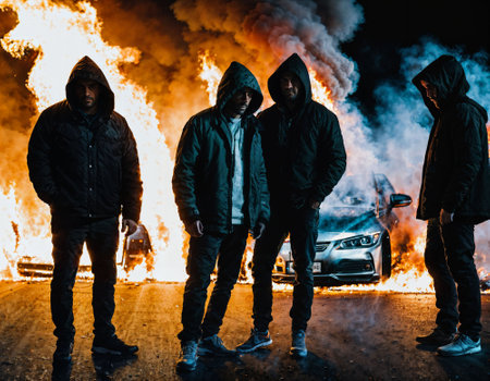 photo of man wearing hoodie jacket in front of burning car cover with fire, generative AI