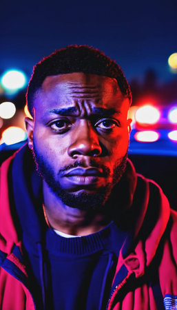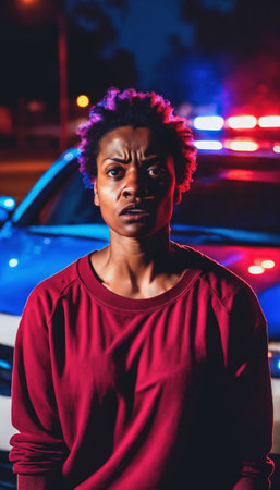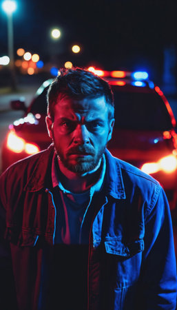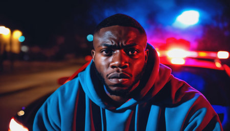 photo of portrait close up view of criminal suspect in crime scene standing in front of police car at night and red blue light, generative AI