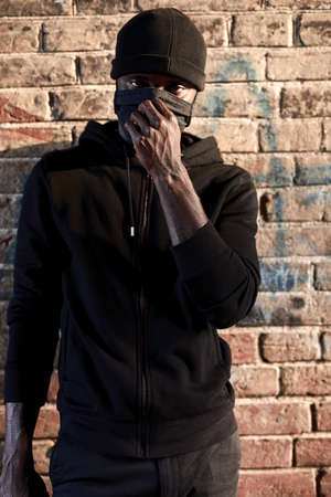 african american man in mask standing by brick wall, hooligan in black wear. black guy pose a danger for society, waiting for victim in dark alley, commit a crime. social problems, crime concept