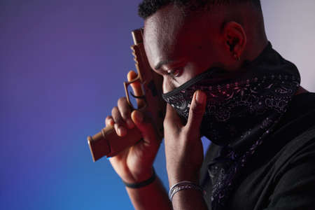 Mask thief with holding gun pointing to the target over sunset sky, Criminal robbery concept