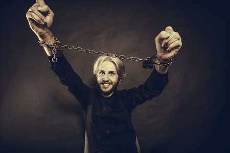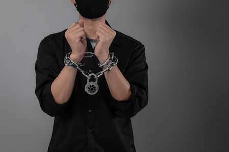 No freedom, social problems concept. Furious man with chained hands, studio shot on dark grunge background