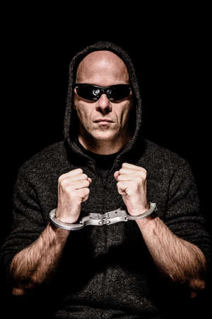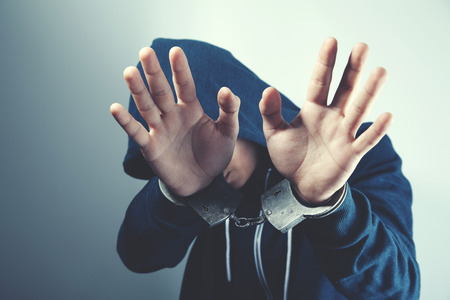 Handcuffed criminal with hoodie and obscured face, unrecognizable hooligan is arrested, selective focus