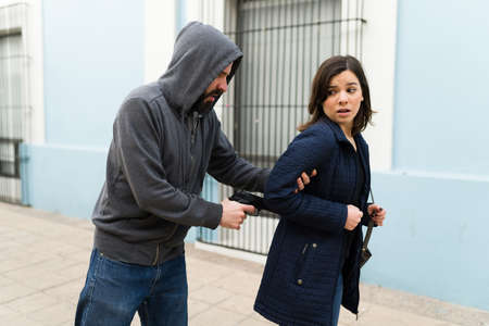 Please don't hurt me. Terrified young woman held at gunpoint and mugged on the street by a violent thief