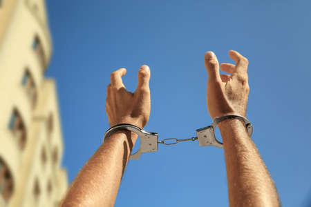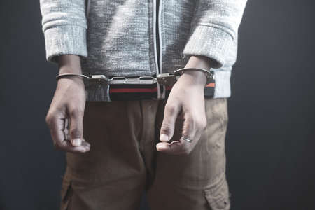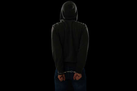 Young man seen from behind while wearing handcuffs after getting arrested by the police for committing a crime