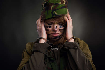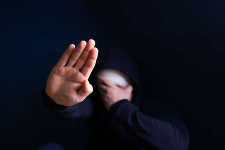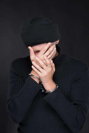 I don� want to prison. Young burglar in handcuffs covering his face with hands while standing against black background