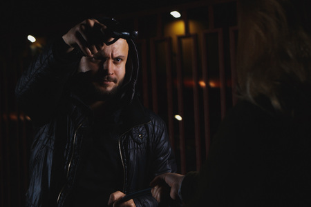 Two stealers are fighting and one of them is pointing a gun on his partner