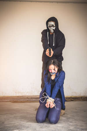A terrorist man in mask holding gun kidnapping young women for a hostage in abandoned building. Rape, terrorism, crime, violence, robbery and killer of women conception.