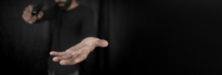 The silhouette of a man in the hood on a black background, his face is not visible, shows hands gesture and a time bomb. The concept of criminal terrorism