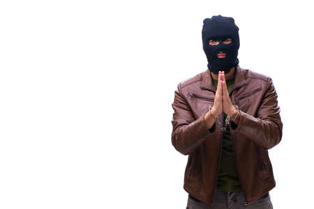 A man in a mask holds a gun in his hand, wearing a hooded jacket over his head, looks at the camera, isolated