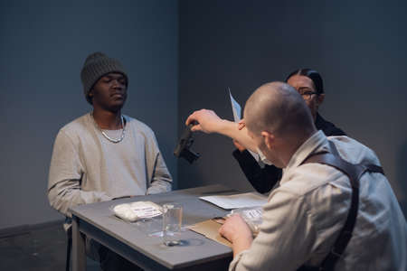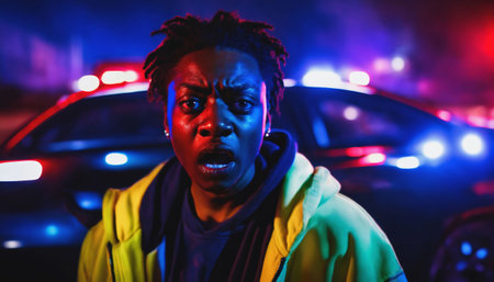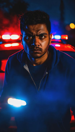 photo of portrait close up view of criminal suspect in crime scene standing in front of police car at night and red blue light, generative AI