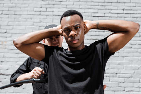 panoramic orientation of policeman in cap detaining african american man with raised hands, racism concept