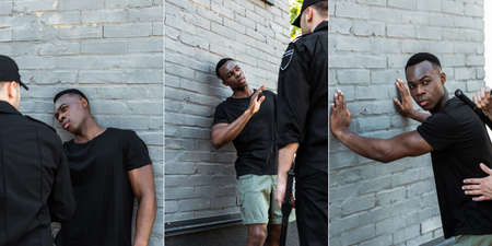 collage of worried african american man looking at policeman and standing near brick wall, racism concept