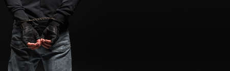 Cropped view of african american bandit in handcuffs isolated on black, banner