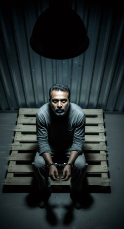 Man in handcuffs sits on a wooden pallet in a dark room. Concept of arrest, detention, imprisonment, or interrogation.