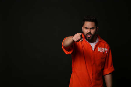 Remorseful prisoner in striped uniform with handcuffs hiding his face on black background, space for text