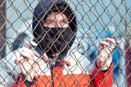 a man in a hood and a mask in front of a mesh fence, restriction of rights. travel ban