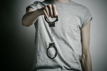Prison and convicted topic: man with handcuffs on his hands in a gray T-shirt on a gray background, put handcuffs on rapist