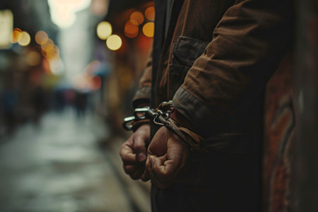 Hands secured in metal handcuffs, highlighting the feeling of restraint and confinement, with a dark and moody background creating a dramatic atmosphere