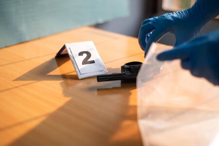 Scientific police picking up bullet in evidence bag, conceptual image