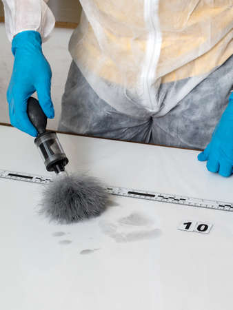 CSI Scientific Investigation Unit male researcher collecting fingerprints from crime scenes and incident sites with blue lights