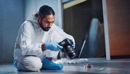 Forensic Investigator Documenting Crime Scene Evidence with Camera and Protective Gear for Analysis