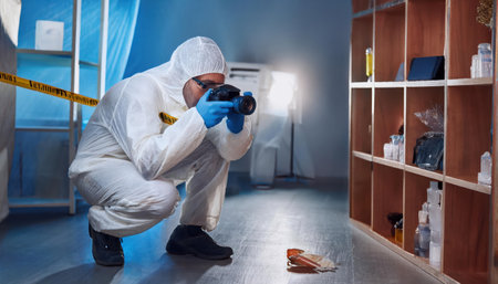 Man in hazmat suit and goggles taking a picture of crime scene