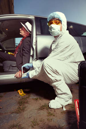 Criminologist taking photo of evidence at crime scene with dead body in car