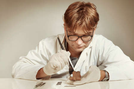Scientist examines tests of cutting weapon of crime in a laboratory, conceptual image