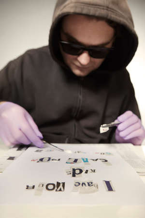 Criminal in hooded shirt preparing ransom letter from newspaper