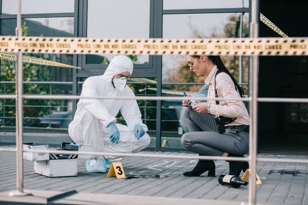 Female detective writing explanation to the criminologist at crime scene