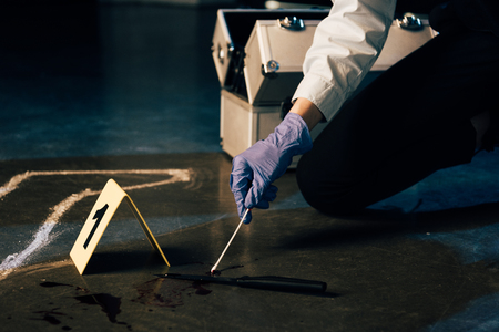 partial view of investigaror in gloves searching for dna evidence at crime scene