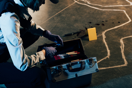cropped view of investigator in rubber gloves with investigation kit at crime scene