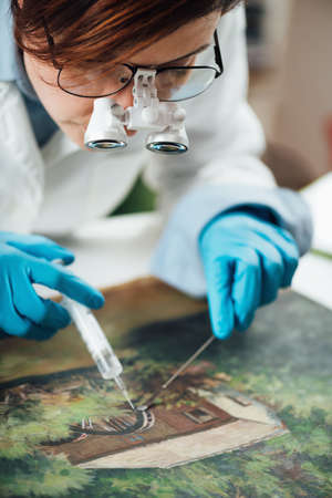 Conservator restoring an old oil painting, revitalizing canvas with syringe