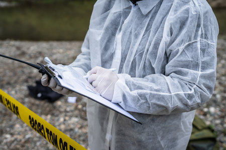 Close up on hands of unknown man crime scene detective inspector during investigation collecting evidence on the crime scene forensics write in chart