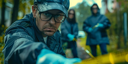 Law enforcement professionals investigate crime scene gather evidence analyze suspects. Concept Forensic Science, Crime Scene Investigation, Evidence Collection, Suspect Analysis, Law Enforcement