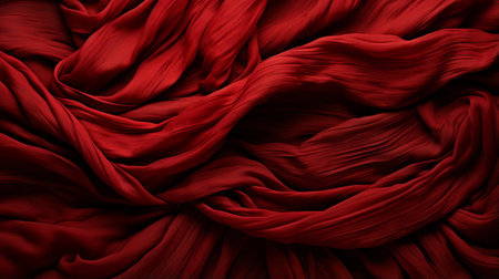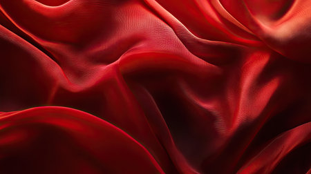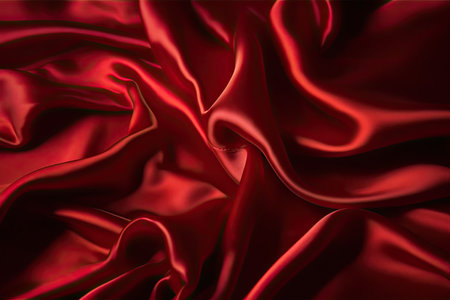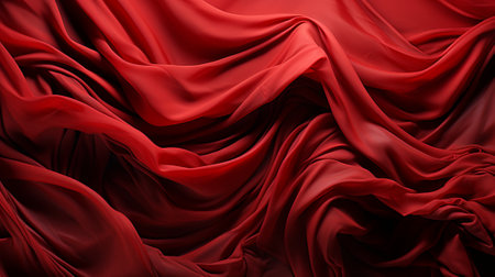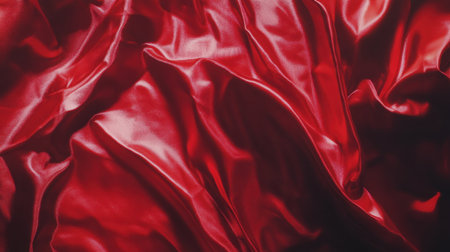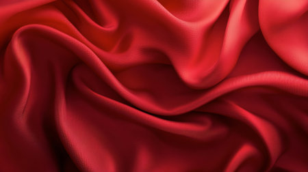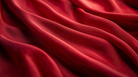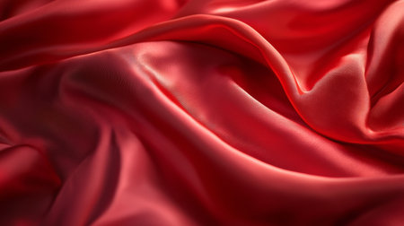 Close-up of elegant red silk fabric draped in soft waves showcases a rich texture and smooth surface, perfect for luxury design and artistic projects.