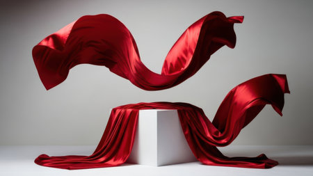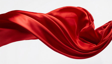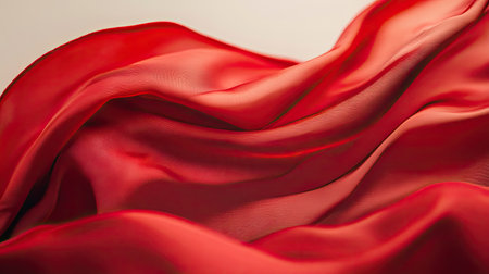 Vibrant red satin cloth caught in wind against soft neutral background, highlighting fluidity, sheen, and luxurious material movement
