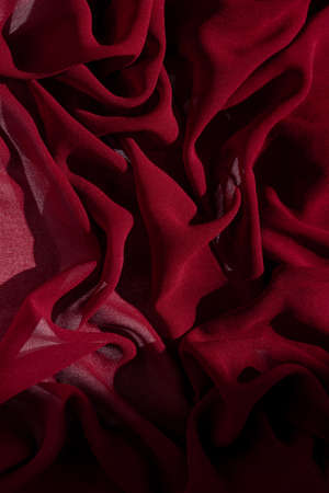 Smooth elegant burgundy chiffon fabric abstract background. Dark red wine silk satin luxury cloth texture on light surface for design. Luxurious Valentine's day backdrop. Wavy matte textured material
