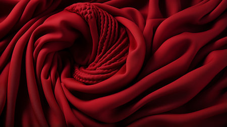 A close-up view of luxurious red silk fabric showcases elegant swirls and delicate folds. Perfect for design projects, fashion shoots, or artistic backgrounds.