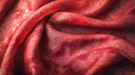 A close-up view of an elegant red fabric featuring intricate patterns and textures. Ideal for fashion, interior design, or artistic projects.