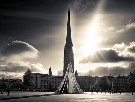 Gothic-inspired spire against a moody sky reflects a blend of historical architecture and modern design
